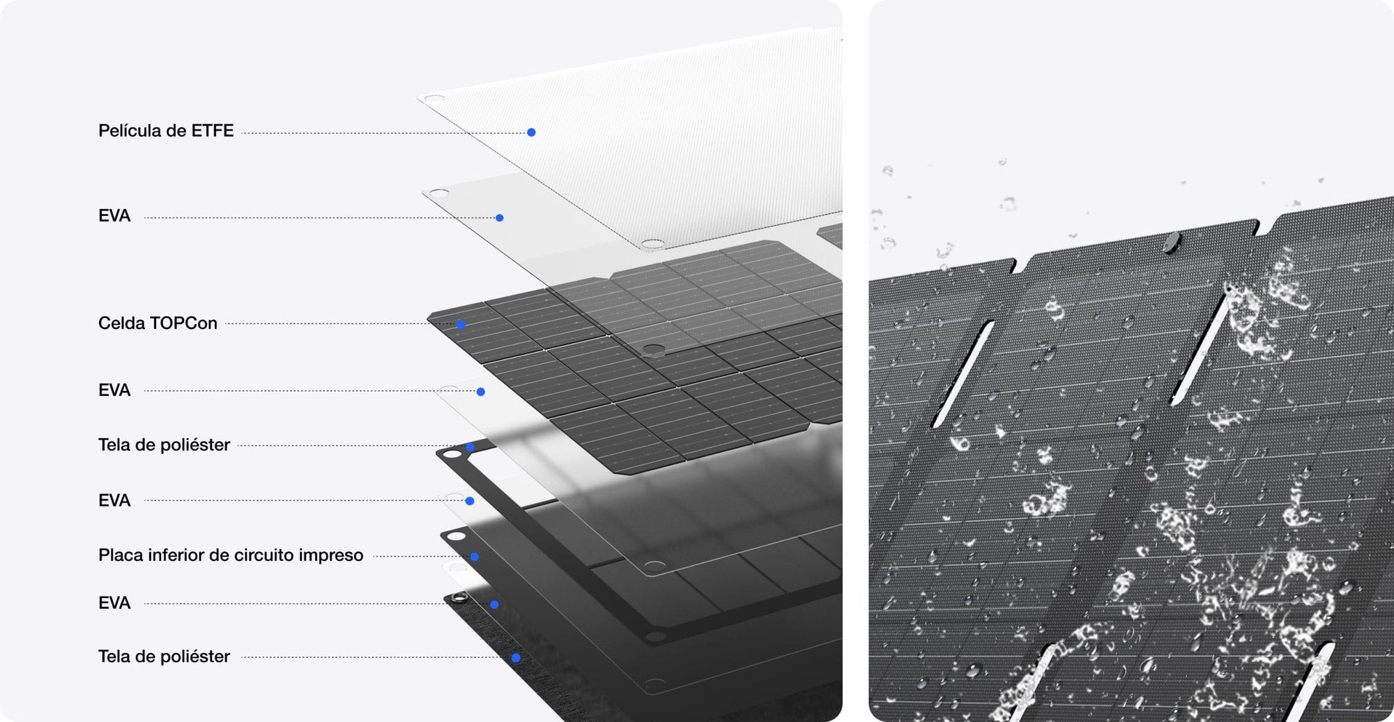 Con una robusta fibra de vidrio PCB y un recubrimiento de ETFE resistente, nuestros paneles están diseñados para soportar las condiciones climáticas más adversas. Tanto si se trata de un impacto brusco, si son arrastrados por el viento o incluso si están expuestos a la atmósfera salada del océano y a gotas de agua, permanecerán intactos y resistentes, y serán tu mejor aliado al aire libre.*